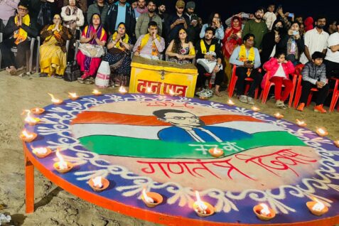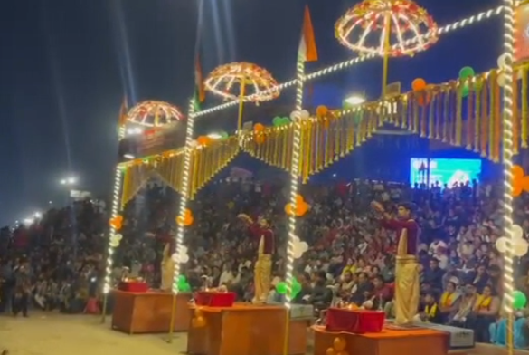 गंगा आरती स्थल को तिरंगे के रंगों में भव्य रूप से सजाया गया था। केसरिया, श्वेत और हरे रंग की रोशनी, पुष्प-सज्जा और आकर्षक सजावट से पूरा घाट देशभक्ति के रंग में रंगा हुआ दिखाई दिया। आरती शुरू होते ही ‘भारत माता की जय’ के जयकारों से वातावरण गूंज उठा।