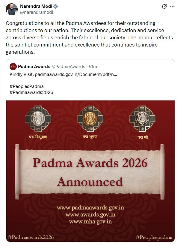 प्रधानमंत्री नरेंद्र मोदी ने एक्स (X) पर सभी पुरस्कार विजेताओं को बधाई देते हुए कहा, “देश के सभी पद्म पुरस्कार विजेताओं को हार्दिक शुभकामनाएं। विभिन्न क्षेत्रों में उनके उत्कृष्ट योगदान ने हमारे समाज को समृद्ध किया है। यह सम्मान आने वाली पीढ़ियों को प्रेरित करता रहेगा।”