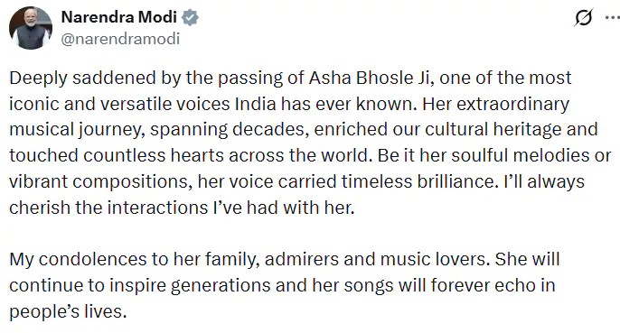 प्रधानमंत्री नरेंद्र मोदी ने आशा भोसले के निधन पर गहरा दुख व्यक्त किया। उन्होंने कहा कि आशा जी की आवाज ने दशकों तक भारतीय संगीत को नई ऊंचाइयों तक पहुंचाया और उनकी गायकी ने दुनियाभर के लोगों के दिलों को छुआ।