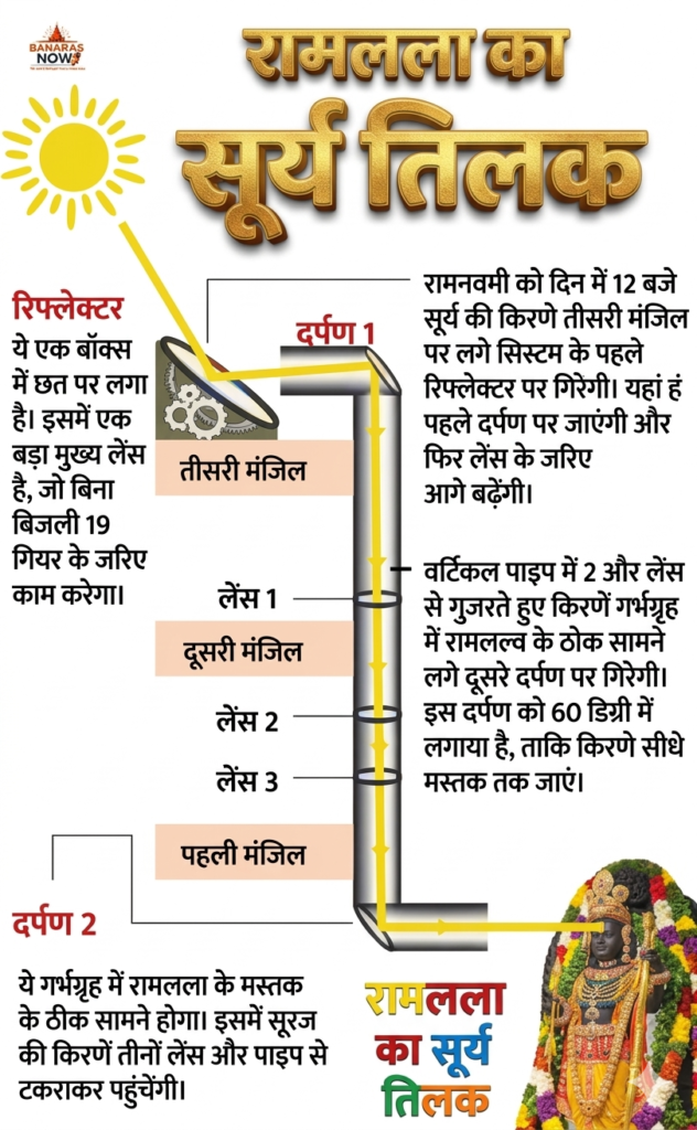 इस दौरान करीब 4 मिनट तक सूर्य की किरणें सीधे भगवान राम के मस्तक पर पड़ीं, जिससे पूरा मंदिर परिसर दिव्यता से भर गया। यह विशेष ‘सूर्य तिलक’ भारतीय वैज्ञानिकों द्वारा तैयार किए गए दर्पण और लेंस के अनोखे संयोजन से संभव हुआ।